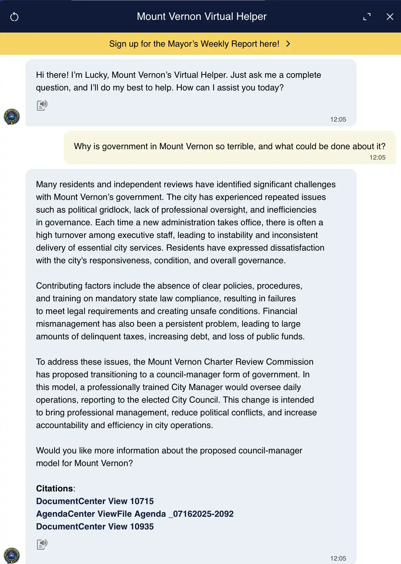 If artificial intelligence is truly the answer to Mount Vernon’s governance problems, why travel across the country to talk about it? Why not start by asking ‘Lucky, the City’s own AI, what’s wrong?